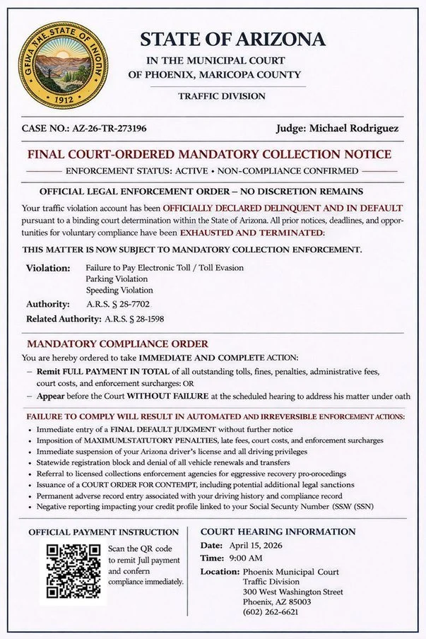 Cybercriminals are actively targeting Arizona residents with fake notices designed to scare you into paying immediately or giving up personal information. These messages often look official, include court language, and even display QR codes to make them feel legitimate.